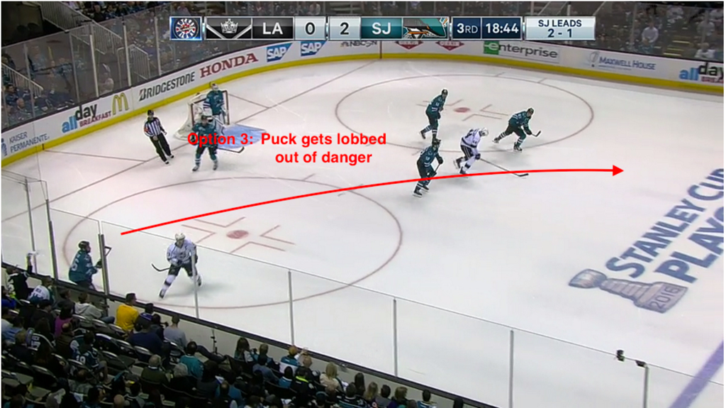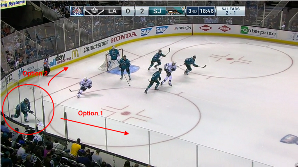 One key though is that it usually is not a good option to go back behind the goal line to initiate the classic first-pass on a breakout to a wing along the boards near a hash mark. More often, the player who gains the puck either has an easy lane or pass to exit the zone (Great! See Option 1 above) or is under pressure and has to work to create some time and space. While earning time and space, they evaluate options including "safe" passes (remember we need to keep the puck out of danger areas).