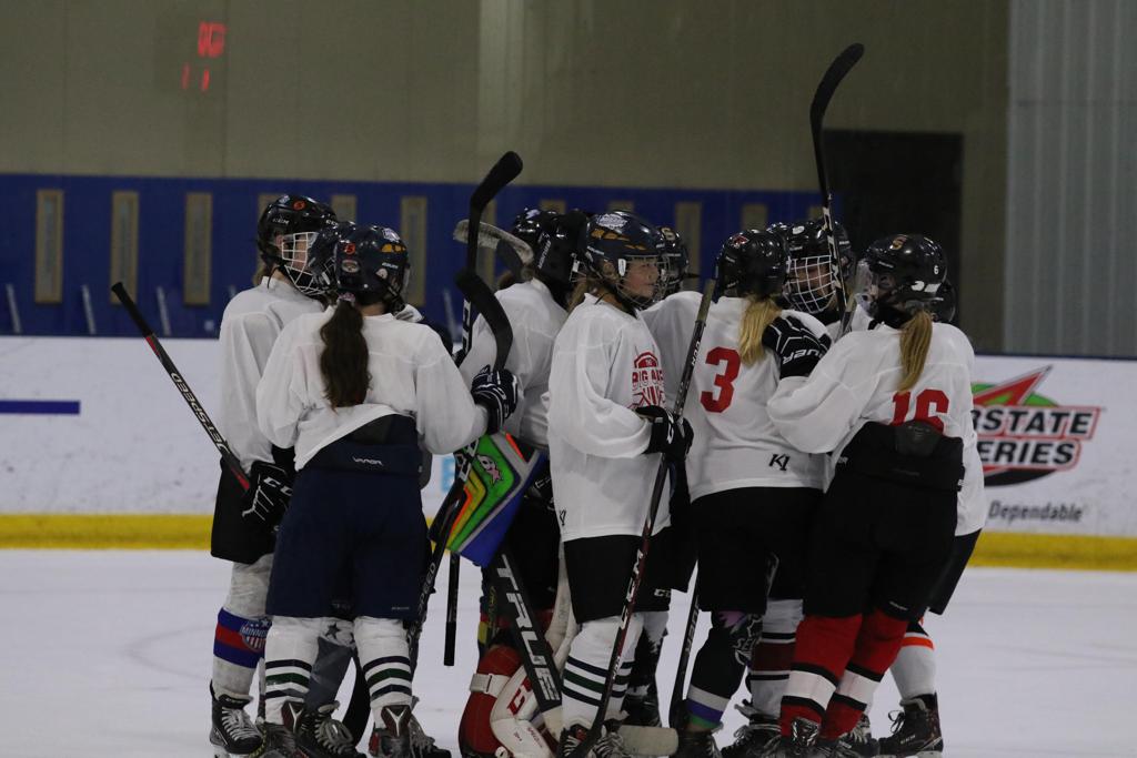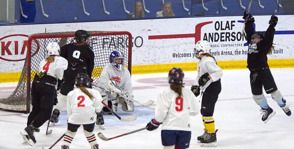 2027 Black's Madison Perrault (right) catches some air while celebrating her goal in Saturday night's win over 2027 White.