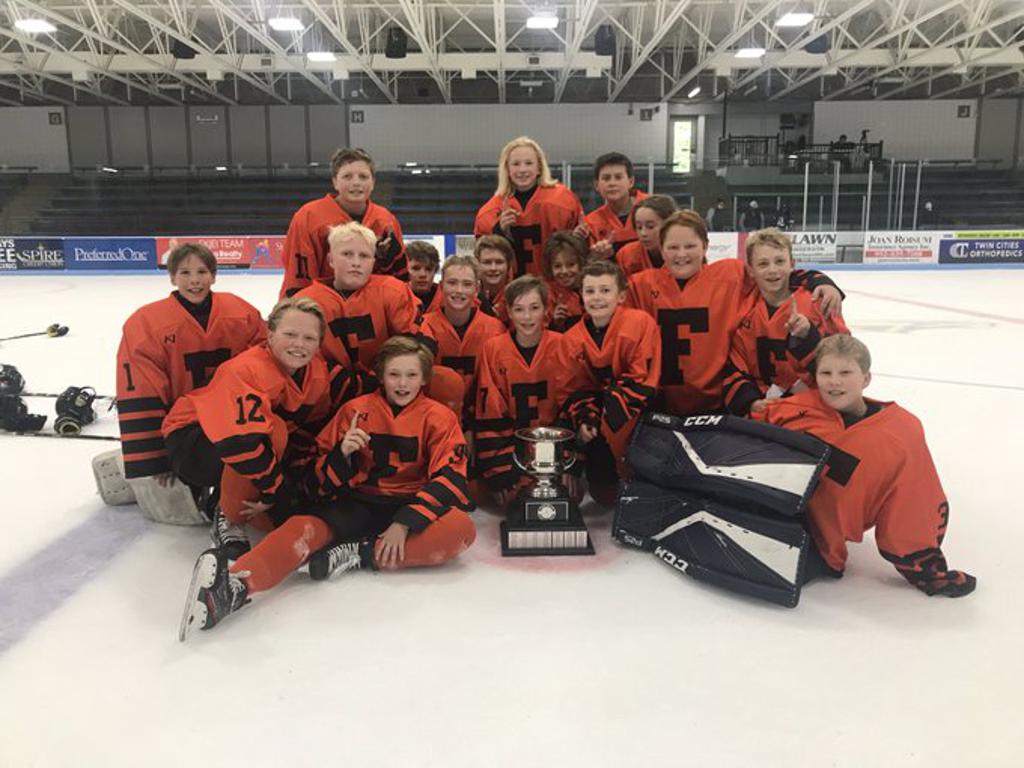 Farmington hosts the Peewee Challenge trophy after defeating White Bear Lake 4-3 in overtime.
