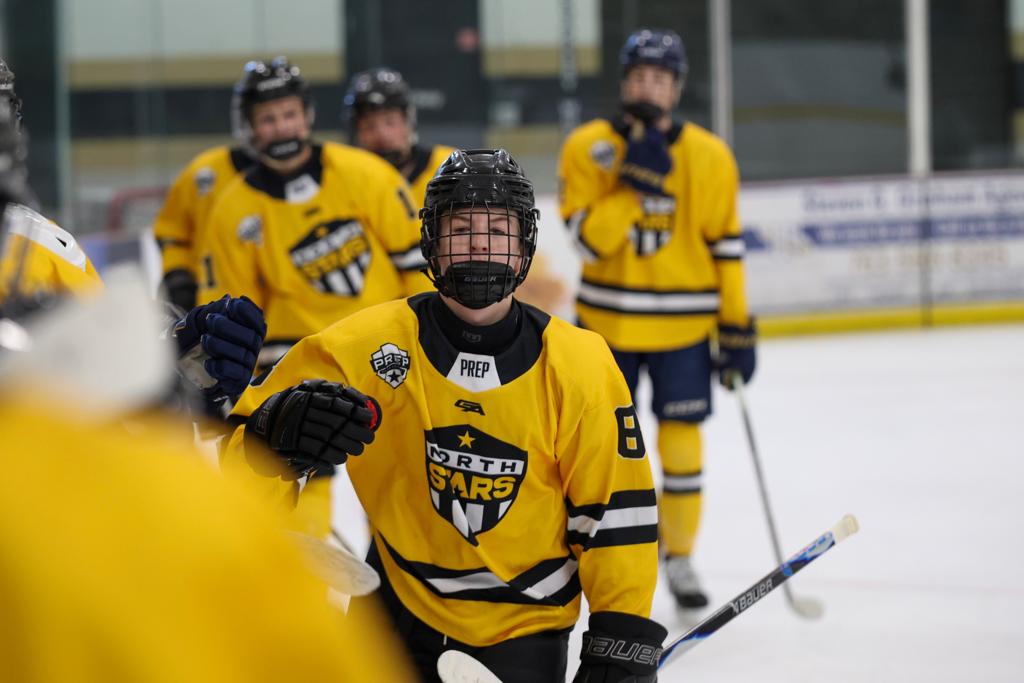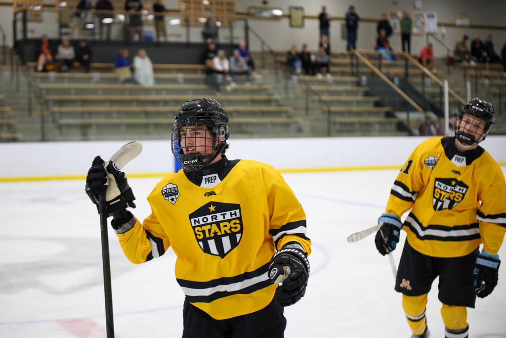 Austyn Maleport skates through the handshake line after scoring in the North Stars' win over ProHybrid on Friday.