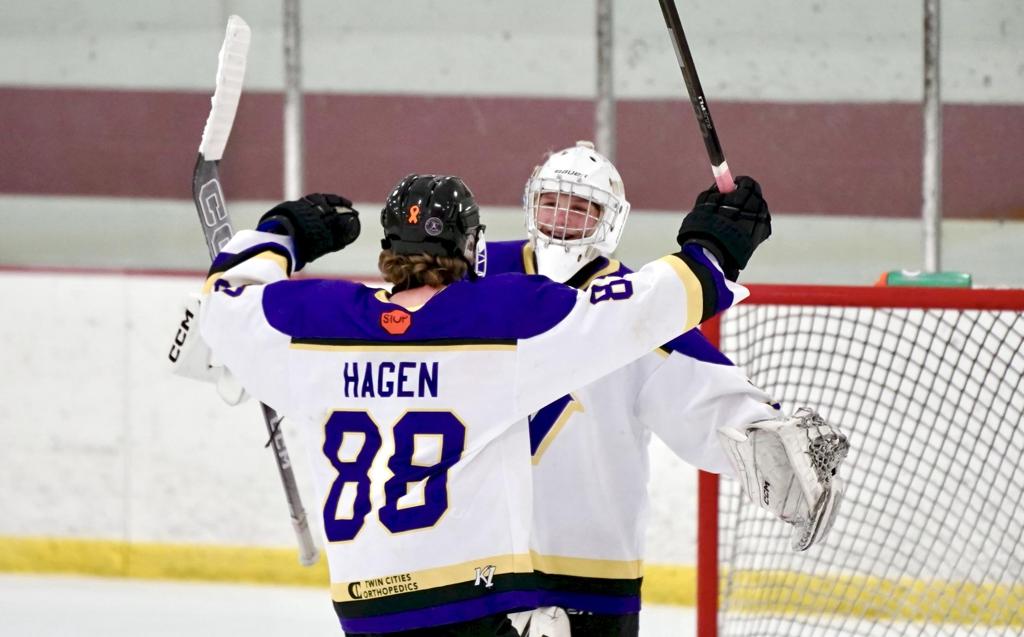 Waconia goaltender Callan Cox gets a hug from Wyatt Hagen after Friday night's 4-3 win over Woodbury.