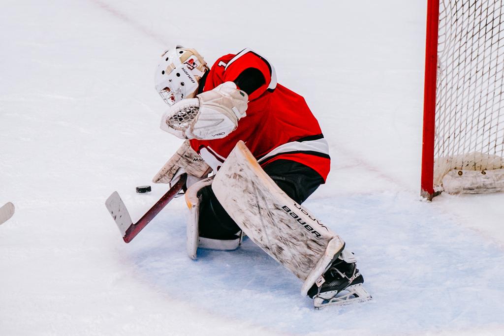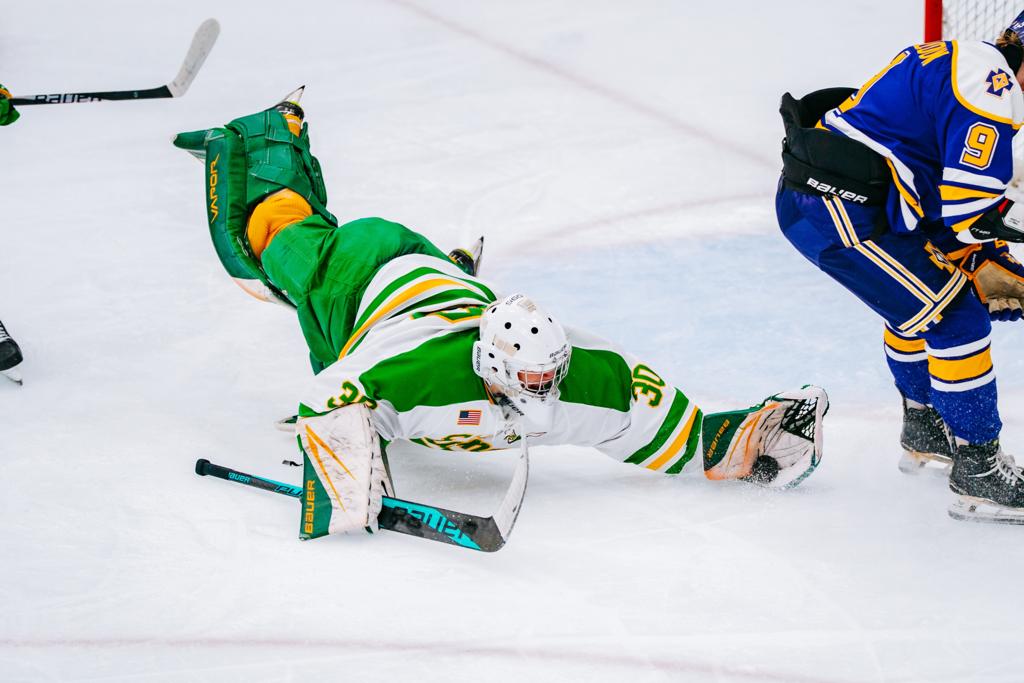 Wyatt Spindler makes one of his 18 saves in Saturday's 4-2 win over Cretin-Derham Hall.