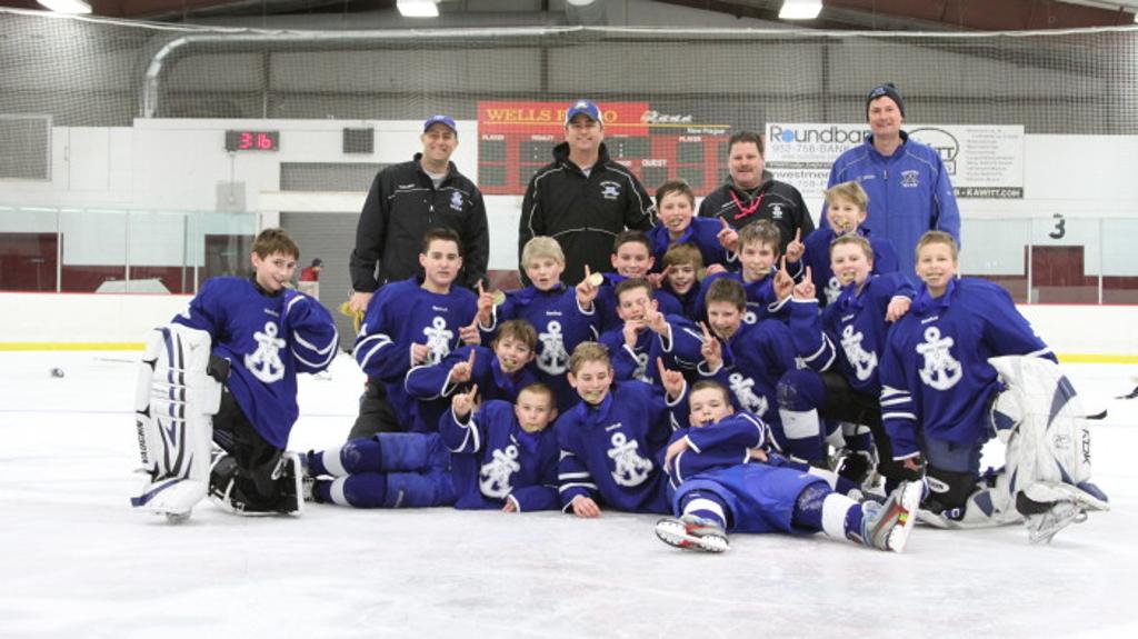 A resurface after the 2nd period gave both teams a chance to recharge their batteries. The Warriors came out highly energized, as they did an impromptu performance of the “Harlem Shuffle” for their fans when they came out of the locker room. Tonka started the 3rd period on a 4 minute power play, due to a double minor penalty at the end of the 2nd period. As these teams proved to each other all year, power plays are deadly. Randy Helling made a nice feed to Cole Schmidt who slid his backhander past the goalie to give Tonka the 4-3 lead just over a minute into the 3rd. Edina survived the rest of the penalty kill, and the next 7 minutes were fast paced and tightly contested. Shots and space were hard to come by for both teams. With 6:35 remaining in the game, Cole Schmidt made yet another game changing play with his forecheck and pressure. He pressured the Edina D near his own blue line, stole the puck, was able to skate past that same defender and fire a hard shot. The goalie made a nice save, but Schmidt secured the rebound and did not miss a second time as he stuffed it past the goalie to give Tonka the 5-3 lead. Tonka could smell the victory now, and the whole team skated the last 6:30 of the game with fresh legs……even though they were tired from the long tournament. Edina was obviously desperate to score and to score quickly, but the Warriors defense was smothering. Each time an Edina player would have the puck, numerous Warriors would swarm. Minnetonka fought the final minutes of the game valiantly, summoning all their remaining energy. Edina managed only 4 shots the entire 3rd period, and only 1 in the final 6:30 of the game. Tonka was able to clear the zone one final time with 6 seconds left, and it was finally over. The Minnetonka PW B2 Blue “Warriors” were the champs!!!! The year long motto for this team was Forecheck, Backcheck, Pass……it’s what we do!!! That is the type of unselfish, team oriented game this team played all year. It was never more evident than this week during the D6 Tourney. This truly was a special team, filled with great kids, wonderful parents and an excellent coaching staff. It was an outstanding season, both on and off the ice, something these boys will remember.
