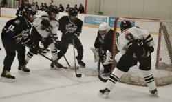 But the key in the opening period was that, except for a few opportunities, both teams stopped the other from getting the good shot. One of those few opportunities came for the Wolfpack early in the period when a rebounding puck ended up bouncing along the top of the Eastview crease.