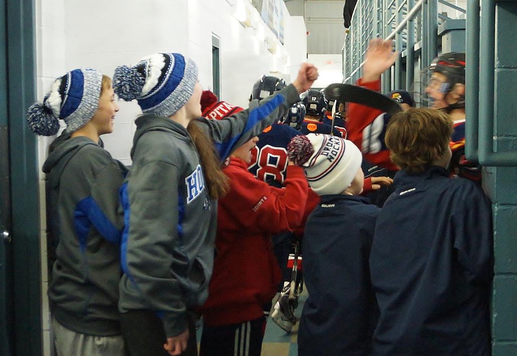 Orono fans high five their heros on their way to the locker room after Friday's Spartan 3-2 win over Edina A