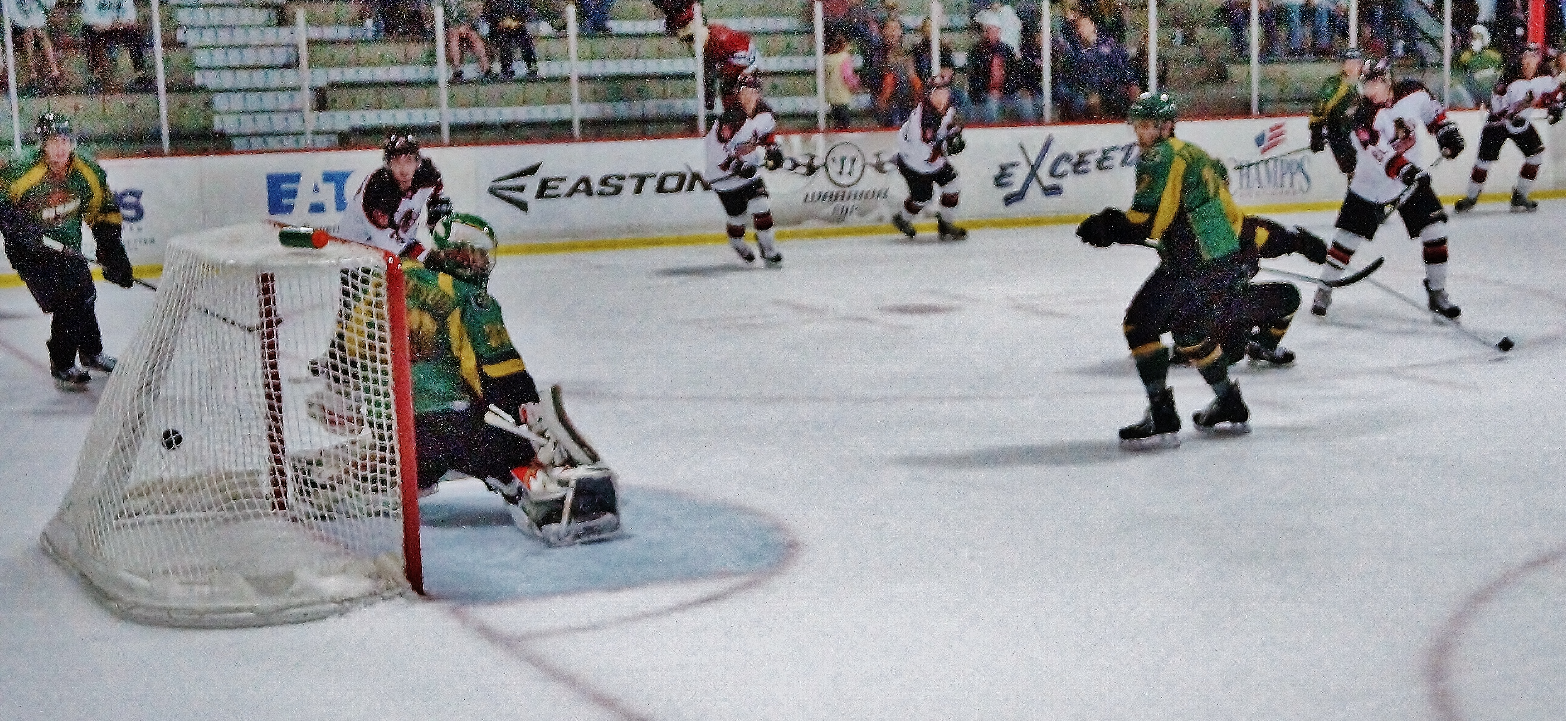 The Magicians score against the Wilderness. The puck was shot from the right side and can be seen entering the net.