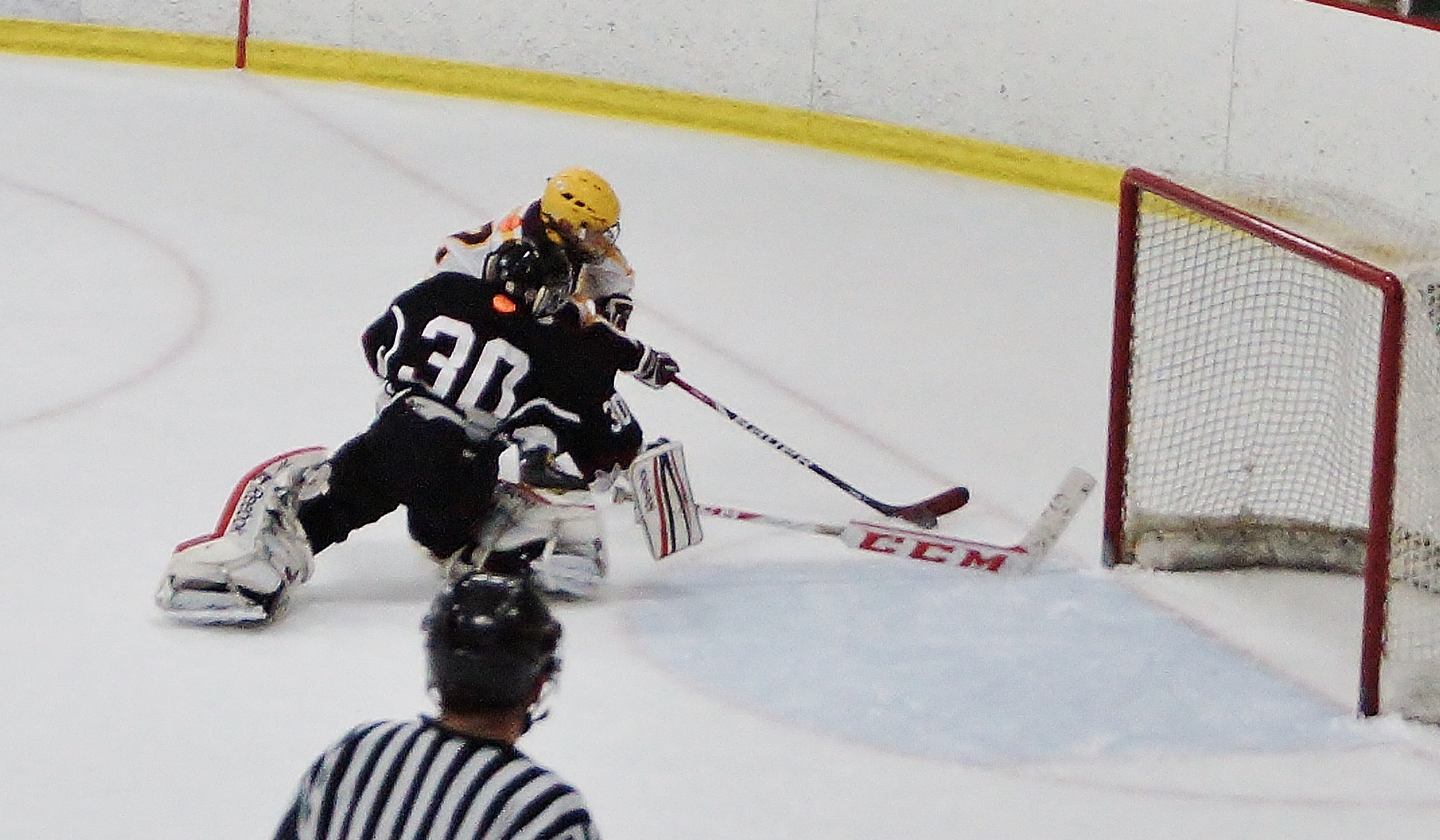 Waukesha's Garrett Larsen stops the Armstrong attack in the Warhawks semifinal loss (note puck can be seen bouncing in front of Larsen)