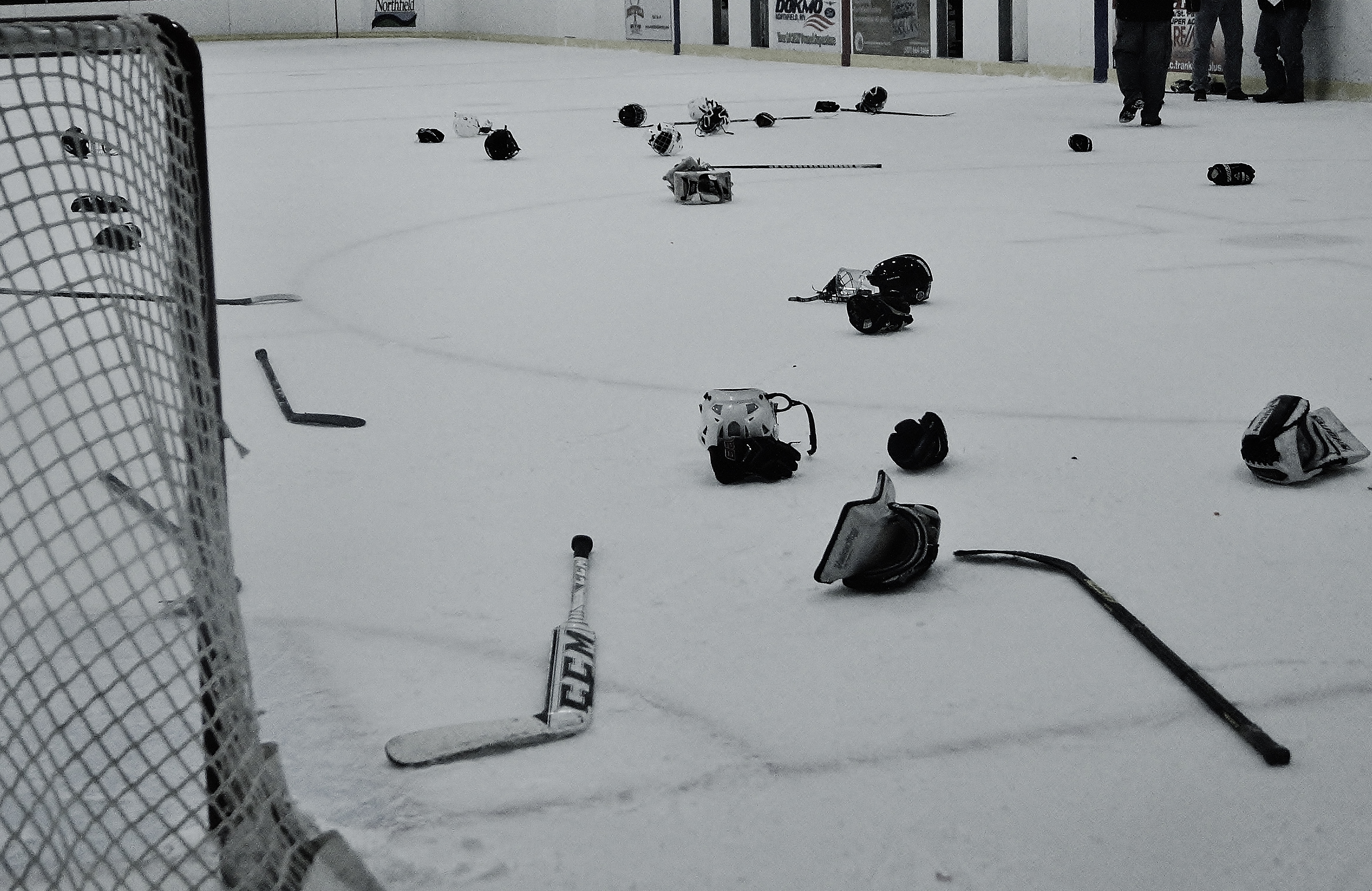 The Champions' gear is strewn about the ice as the Wingers are getting their picture taken. The Northfield Tournament is over. It was a good tourney.