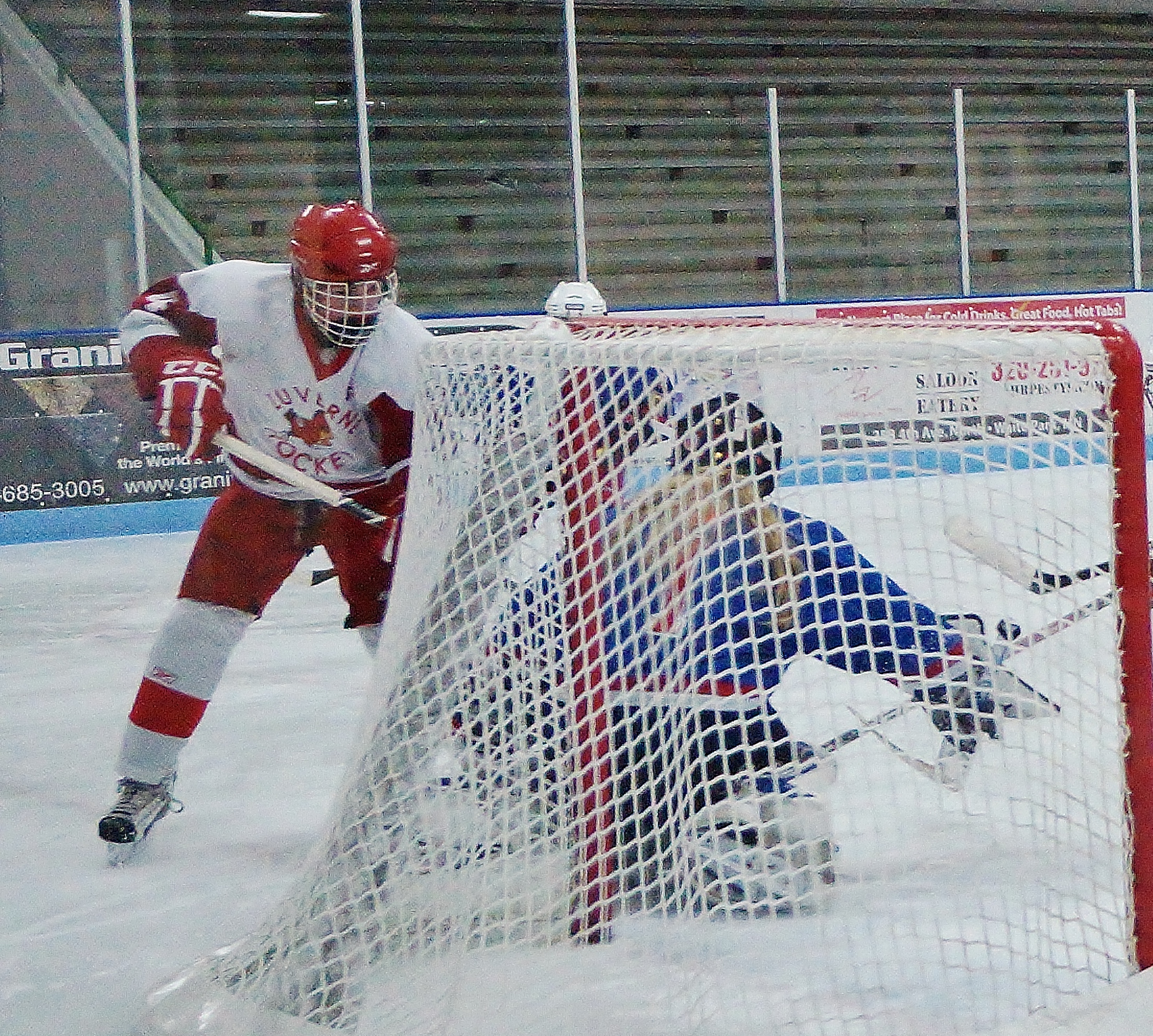 Spring Lake Park scores this controversal winning goal against Alex. The puck had stopped dead on the goal line and never crossed it before being cleared away by a Cardinal (his stick is about to hit the puck in the picture).