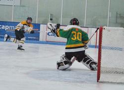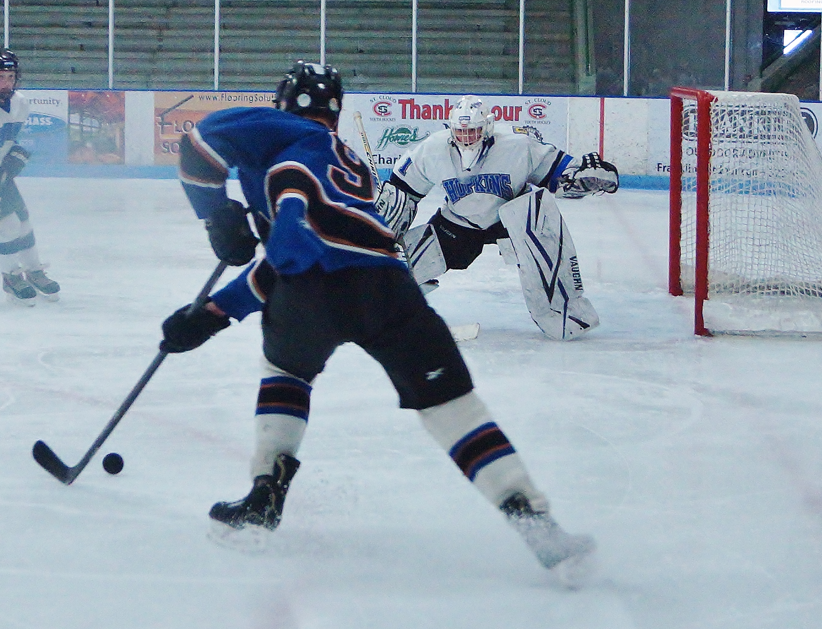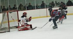 Two good peewee A players Newe Ulm/Sleepy Eye's Landon Strong attacks Hopkins' goalie Oliva Bizal.