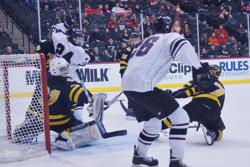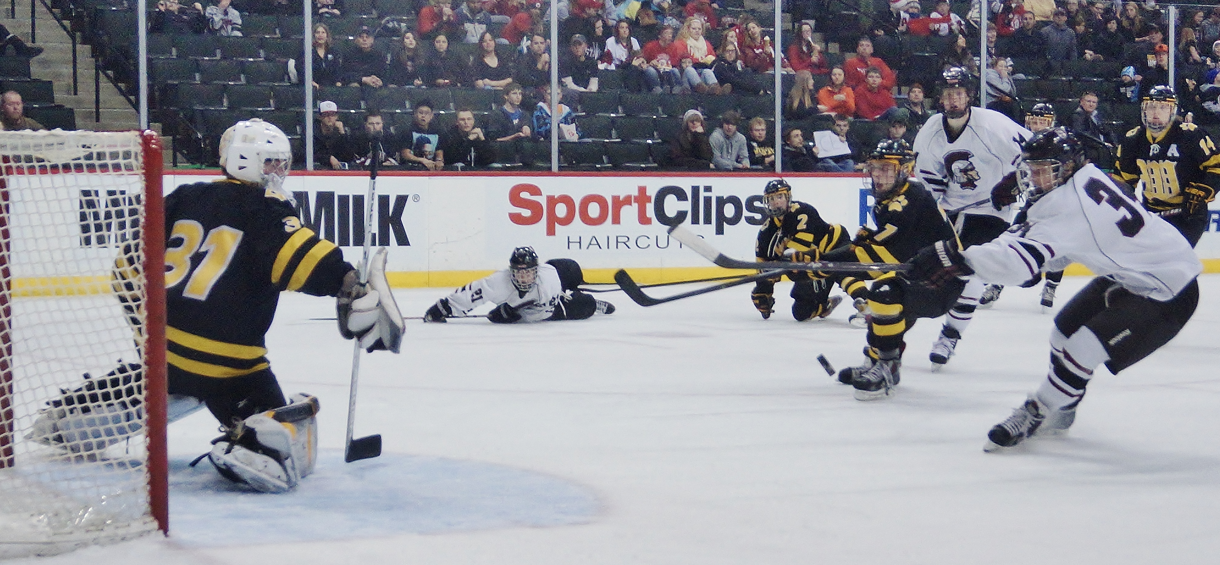 Chisago Lake's goalie Jacob Dubose had a long battle on this sequence to keep the puck out of the net.