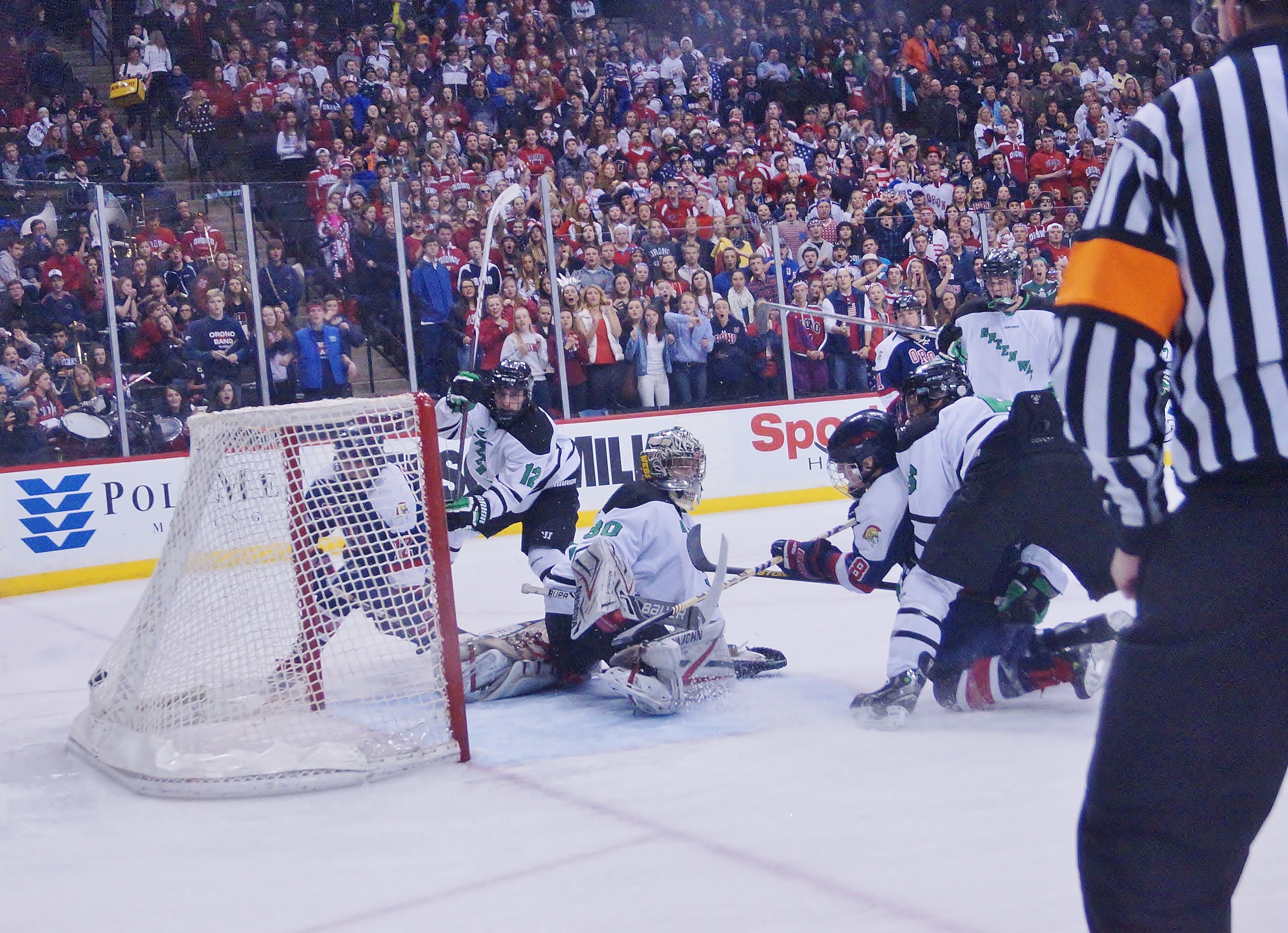 Picture 1: Orono's David McCuskey (#8) scores to cut the Green Wave lead to 3-1. If you are an Orono fan and were at the game, find yourself in this picture.