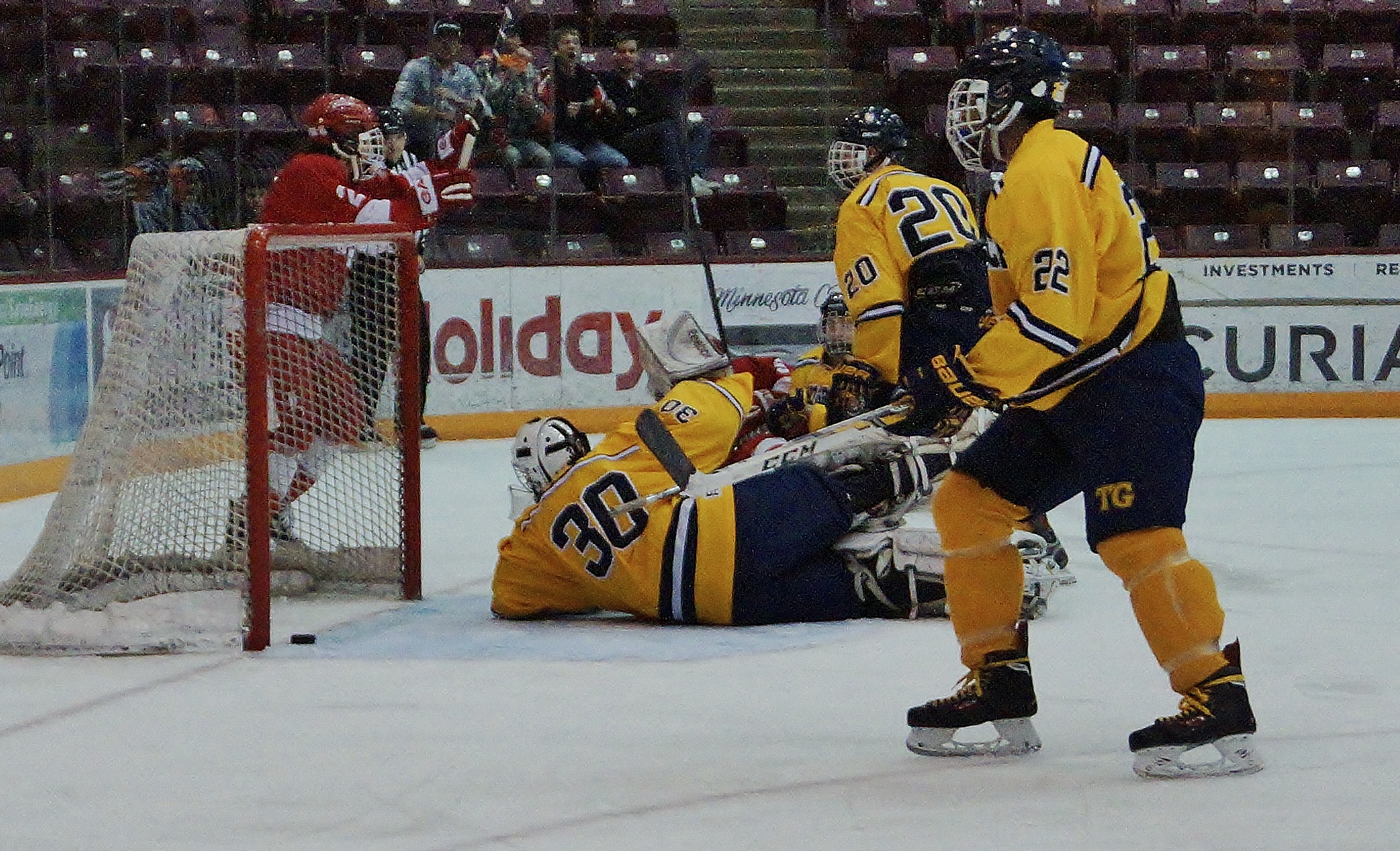 Totino Grace's #17 Jason Krych's shot can be seen above #22 Kai Barber's stick on the way to the net. The puck hit inside the right post, spun around the net and bounced out. It was ruled a no goal.