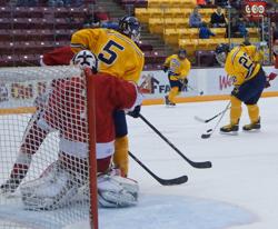 The Eagles kept the pressure on Meyer. Another Grace rush developed out the right side two minutes later and resulted with the Eagles' senior Brandon Hilliard trying to push a puck covered by Meyer on his back into the net. A few minutes later, Grace's senior Alex Johnson's point blank shot shot was blocked away by Meyer.