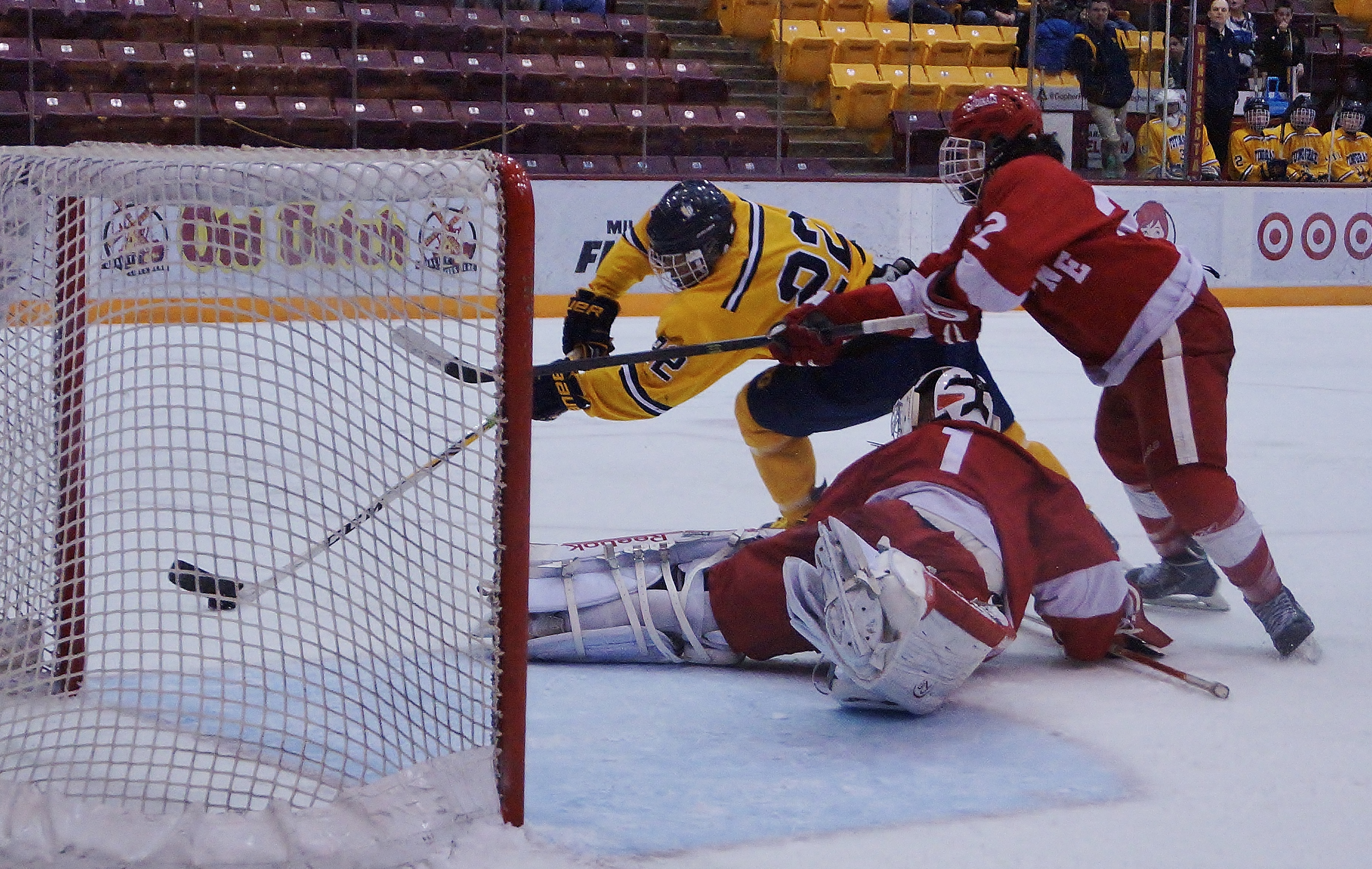 Then came the mystery goal that was disallowed by the refs. Grace shot the puck from the left faceoff area low right with goalie Meyer screened by junior Andrew Schneider. The puck caught the inside right post low and spun around the net and out. No goal was ruled. YHH does not know why. But we have the pictures.