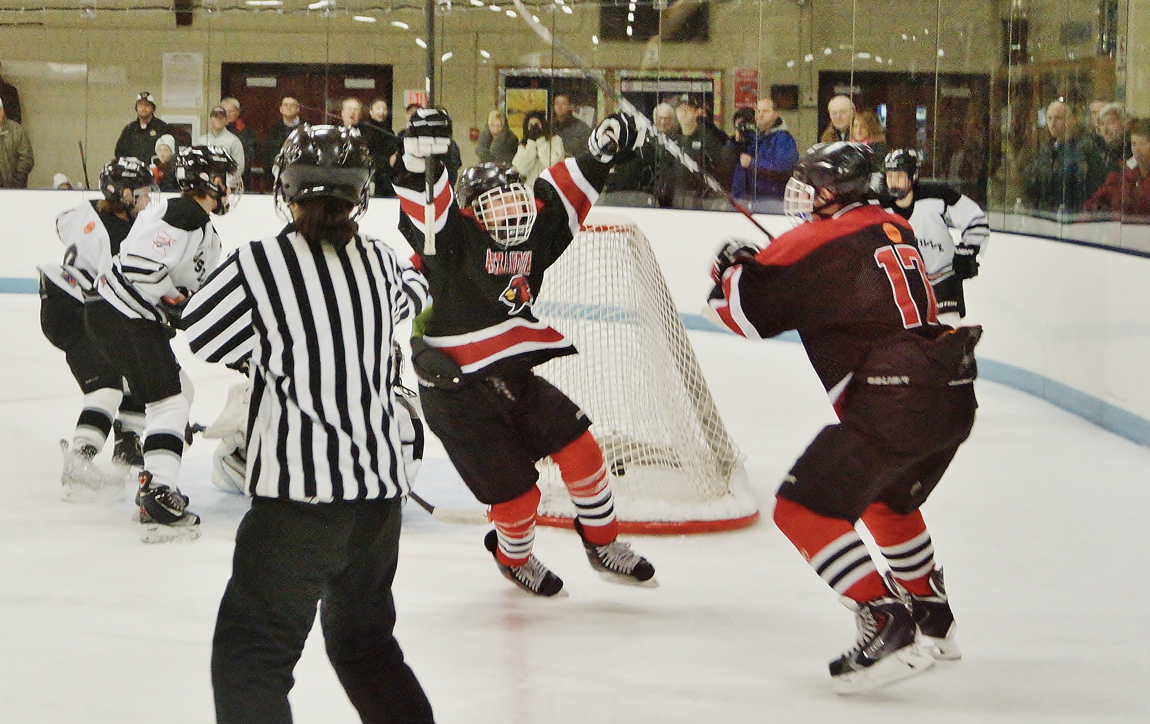 Jack Westlind celebrates scoring the game winning goal in the Burnsville Thanksgiving Tourney (note puck is bouncing in the net).