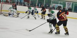 Hermantown's Carter Sullivan (#4) follows his shot in their game against Minnetonka at the State Peewee AA Tourney