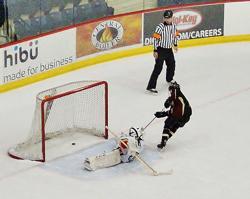 Edina's Grant Silianoff scores on this breakaway in the first period to put the Hornets up 1-0 in the semifinals against Chicago Young Americans.