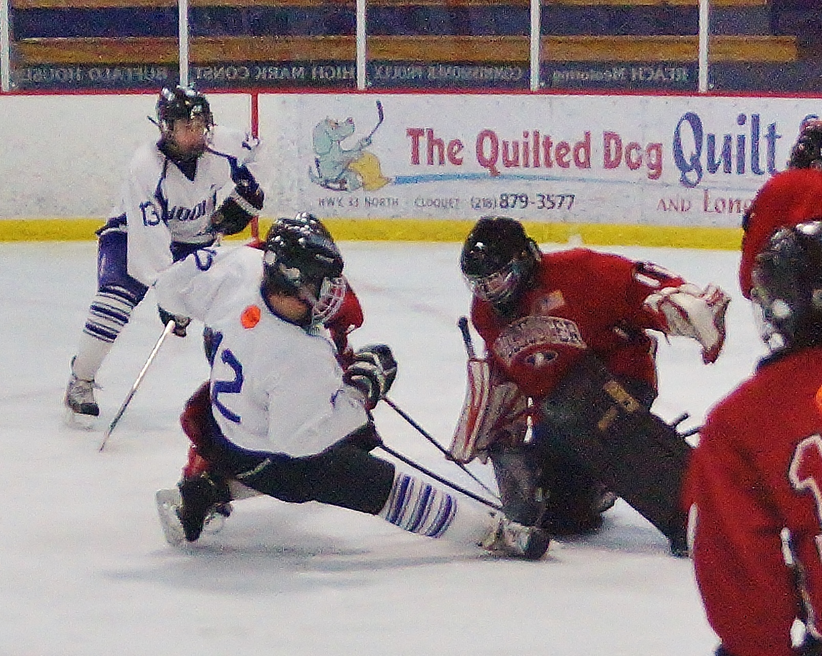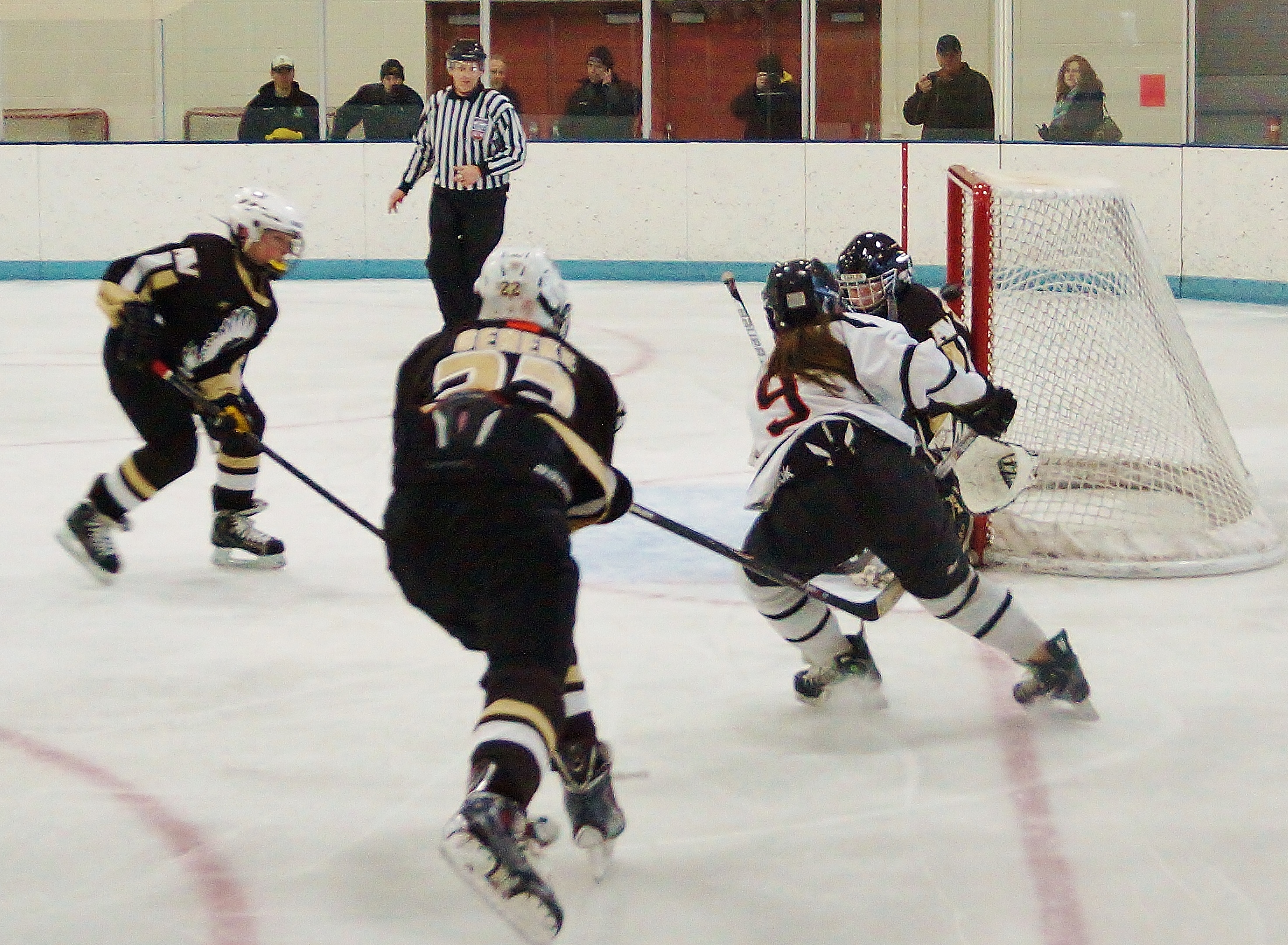 Picture 2: After making the glove save, Harnett is driven back in the net and manages to hold the glove outside the goal line (fooled the goal judge, the goal light is on, but the goal was disallowed). Her save forced the game to OT. Armstrong won 2-1.
