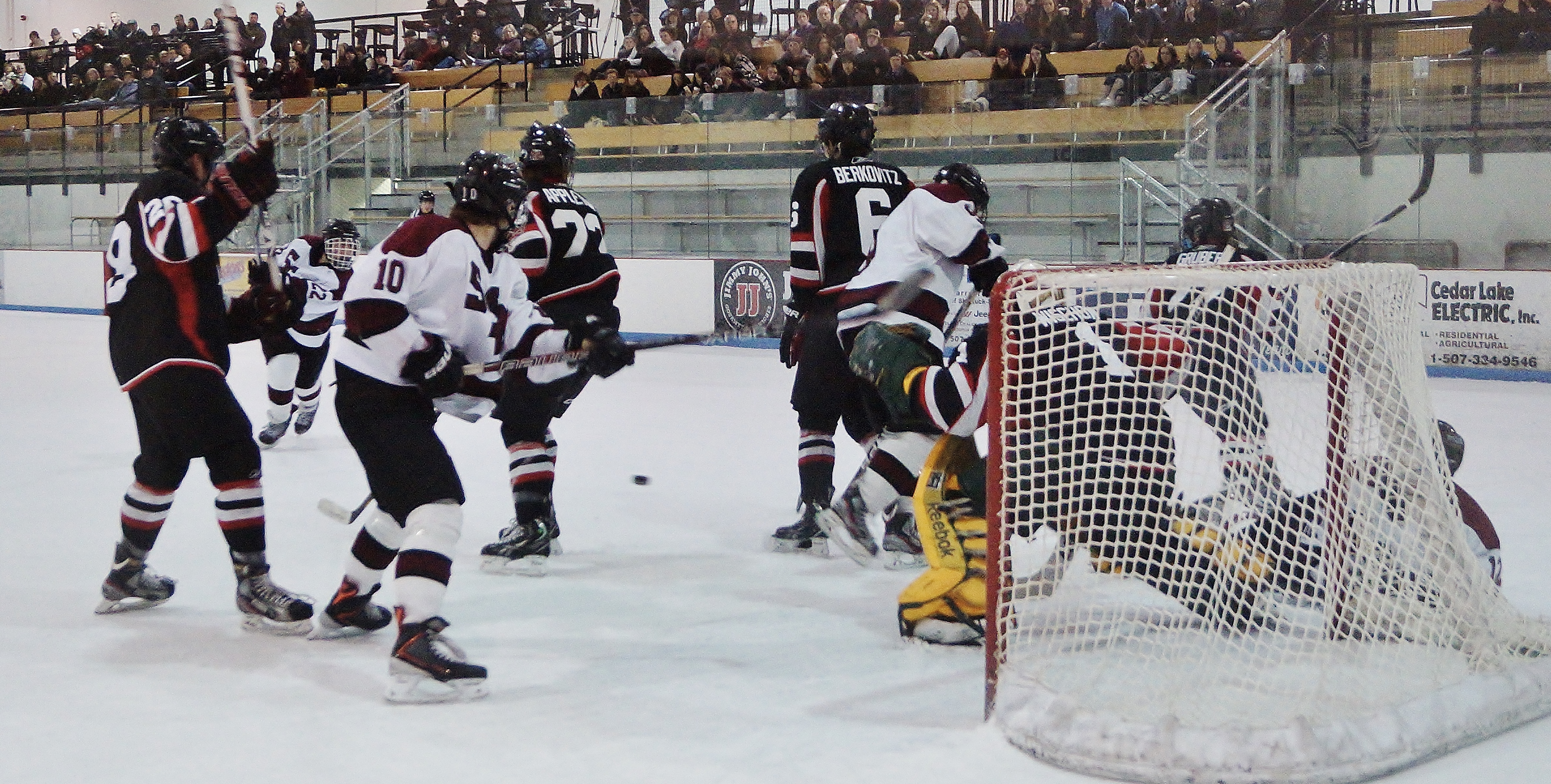 Shattuck's Jeremy Brodeur makes a glove save on a point blank shot by TW's Conner Blanck (#10 left). Brodeur's head and glove are blurred because his speed in making the catch exceeded the ability of the camera to capture a focused picture.