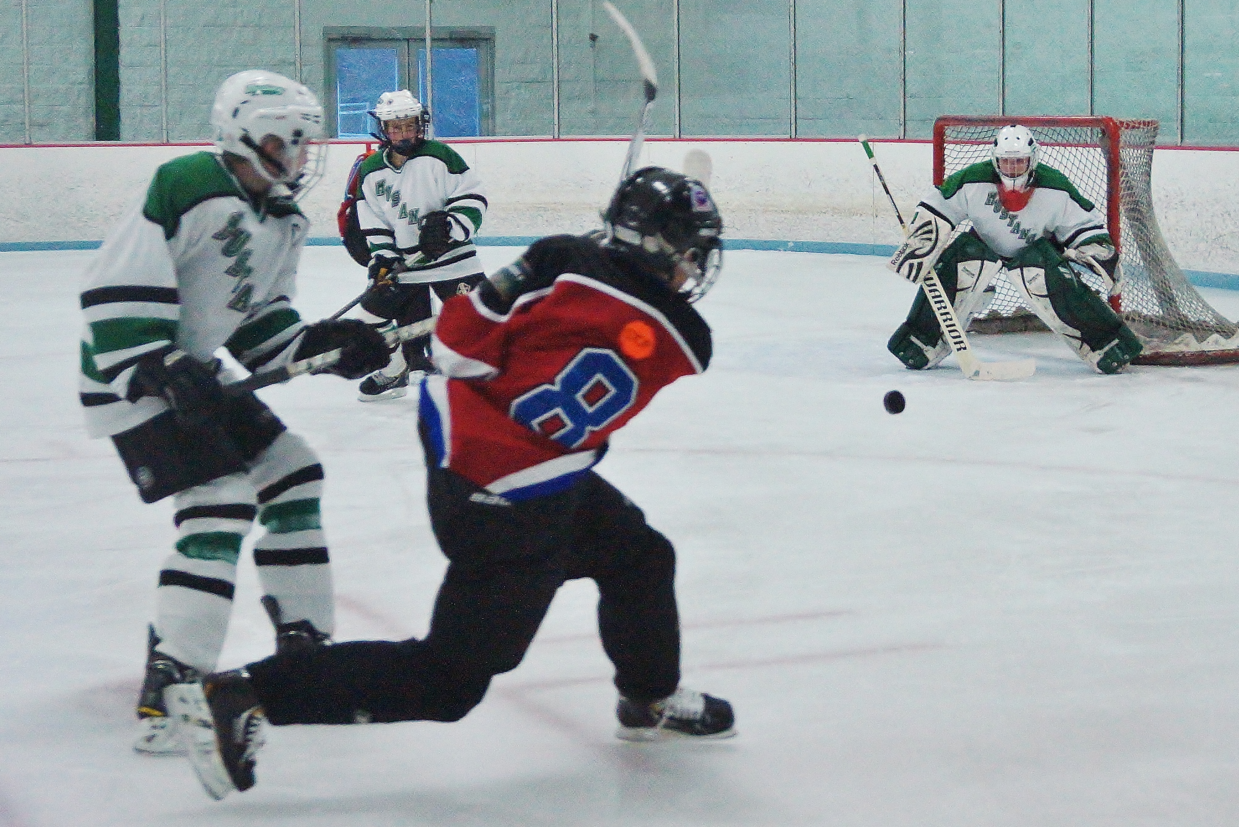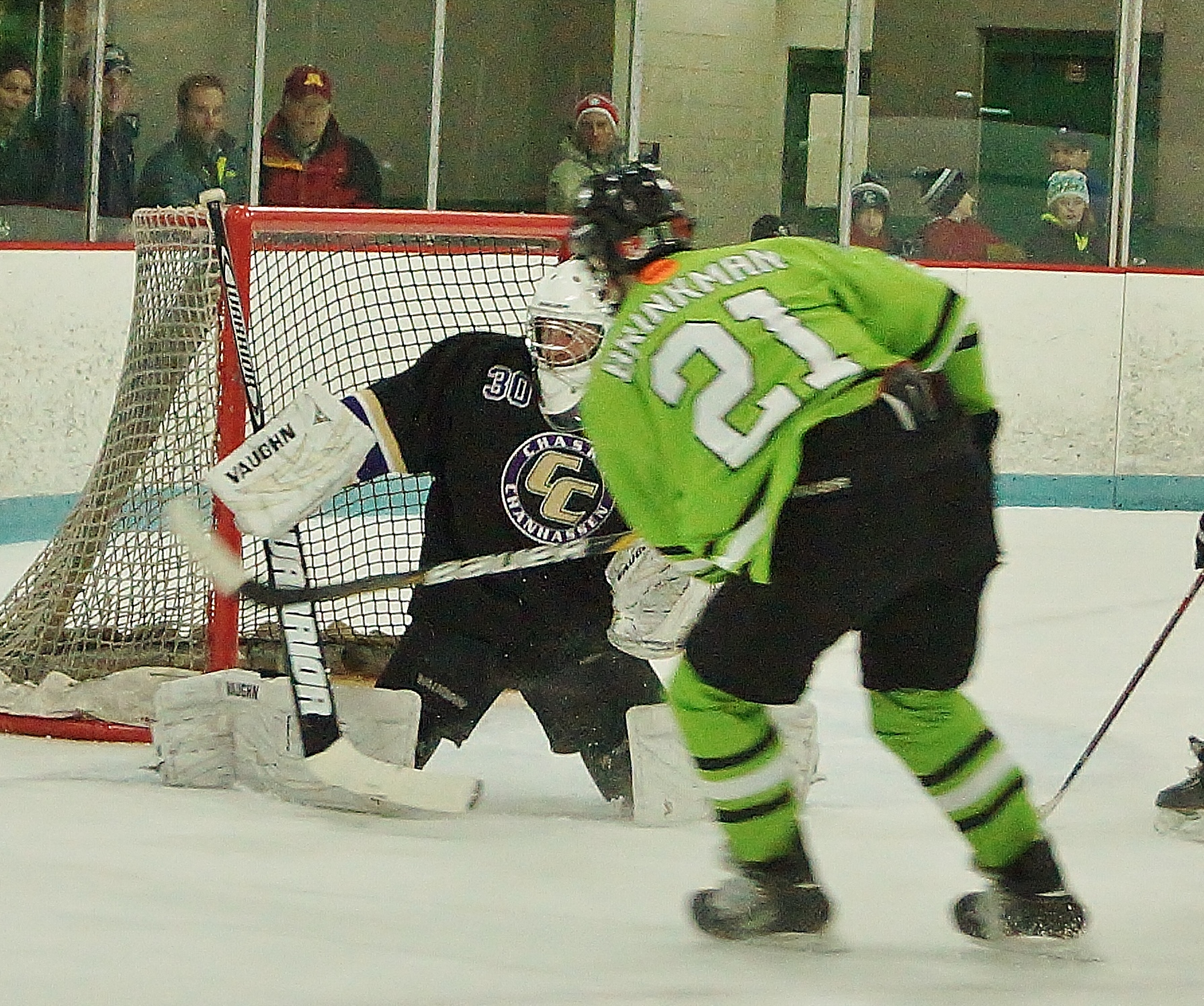 On the play in the picture below, Brinkman is scoring off a rush. The puck can be seen just above Chaska's goalie, Justin Bach, right leg pad. Prior to taking the shot, Brinkman had worked the puck out the right corner, turned in traffic in the right slot, and using the threat of the Edina wing on the left cleared himself off the defense. He then stepped in front of the defense to create the rush from the inside edge of the right faceoff circle and in one stride put the puck in the goal. That is hockey, using the space you have and your teammates to make something out of nothing and gain a scoring edge.