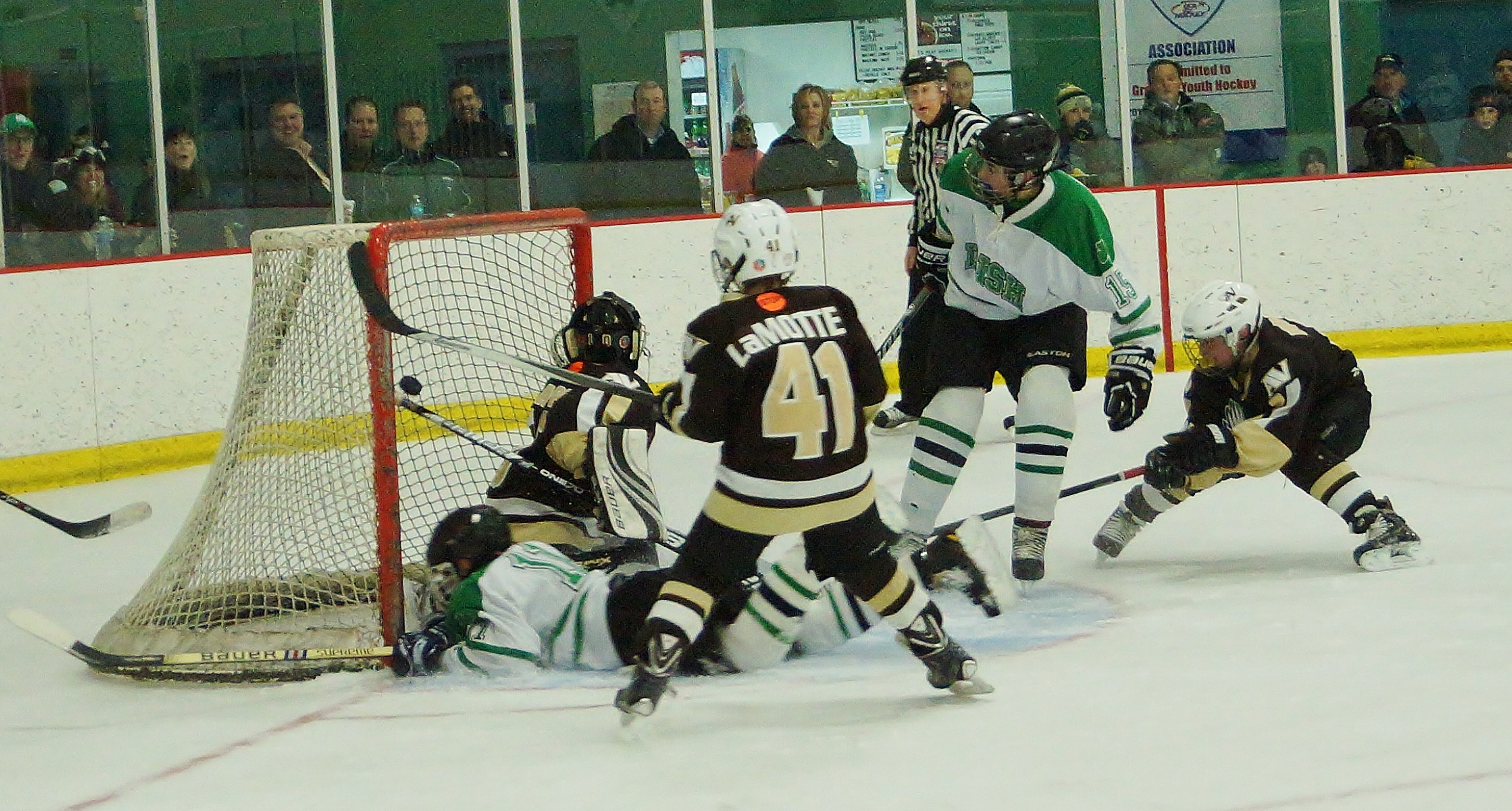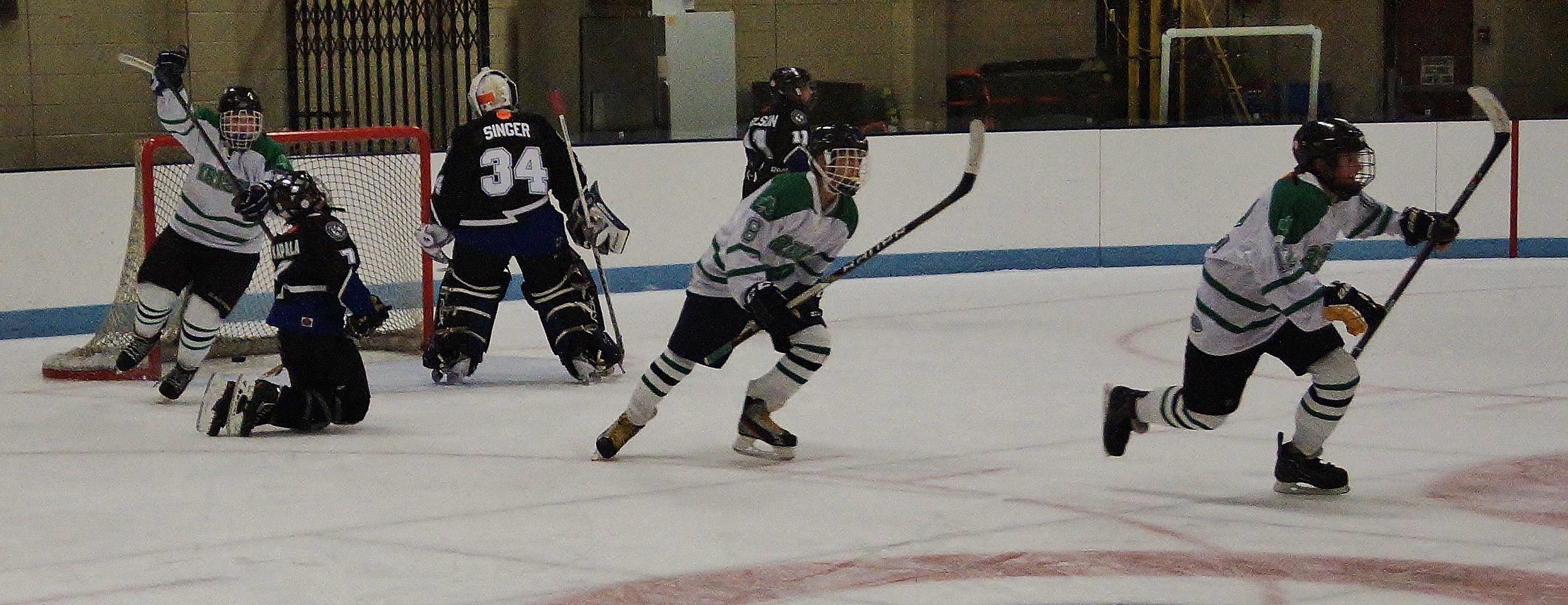 Cloquet's Langenbrunner cuts to the net and knocks the puck out of the Prior Lake's goalie save attempt. The puck goes right to a trailing Lumberjack for the score.