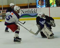 Red Wing's Tyler McGrath makes this glove save on a point blank shot by Armstrong in the Northfield Tourney championship game.