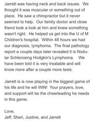 He learned recently that he had Nodular Schlerosing Hodgkin's Lymphoma. Doctors feel it is very treatable. Please pray for Jarrett and his whole family as they take on this wicked disease. To follow his progress go to @Pray4Jarrett on Twitter. The outpouring of support so far has been amazing.