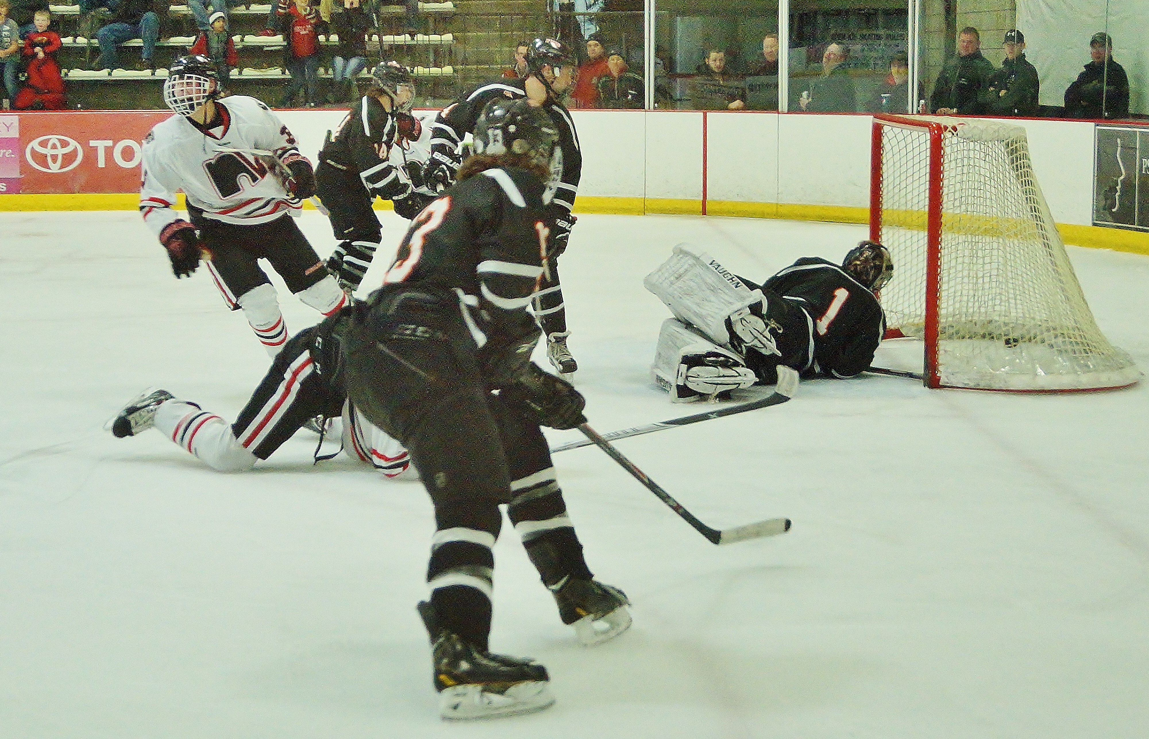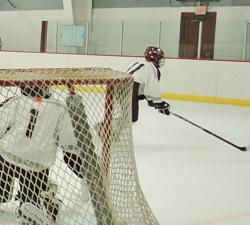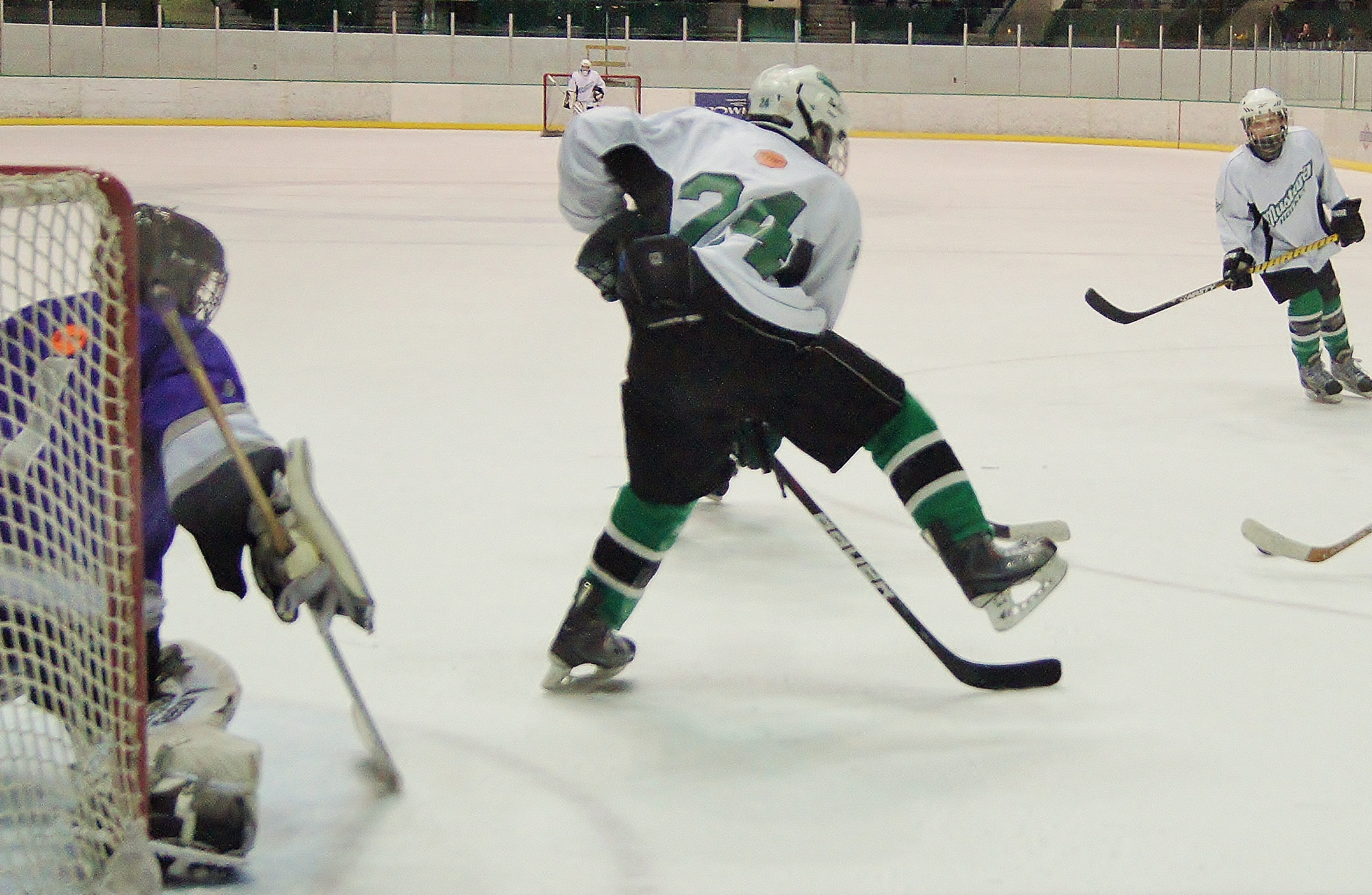 St. Thomas Academy's Willie Reim (#24) leaps to let a shot through on the Buffalo net in this 2012 peewee A game. Reim was played on the Mounds View peewee A team that year.