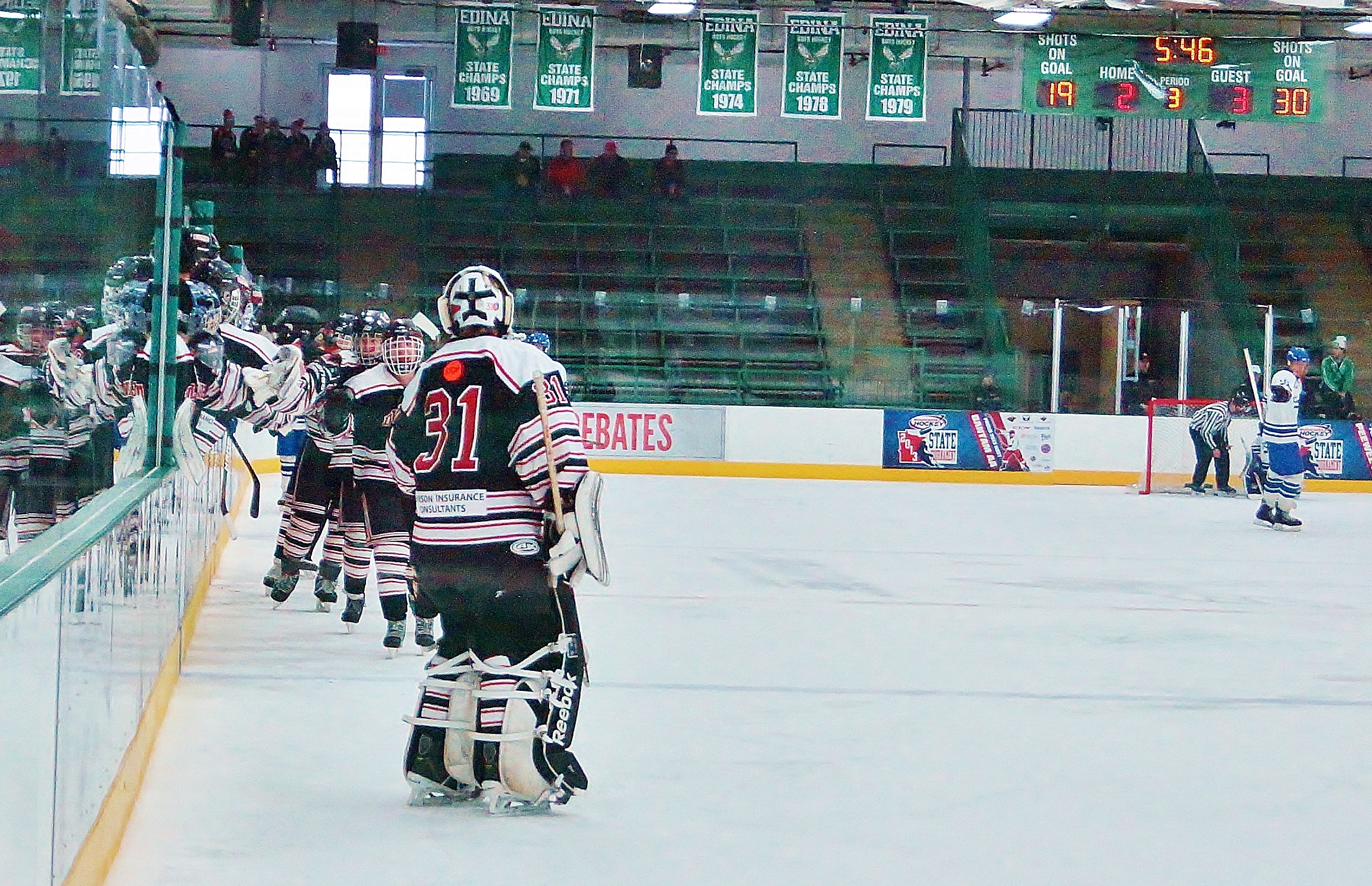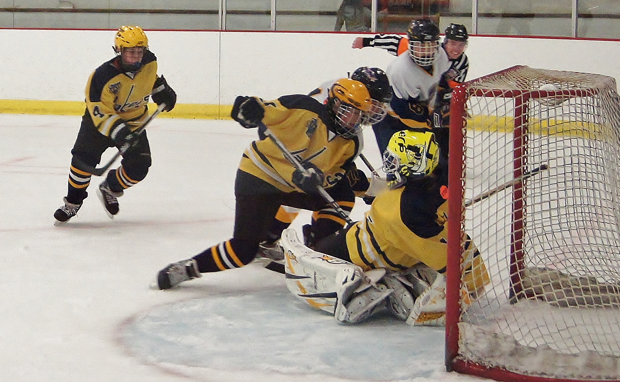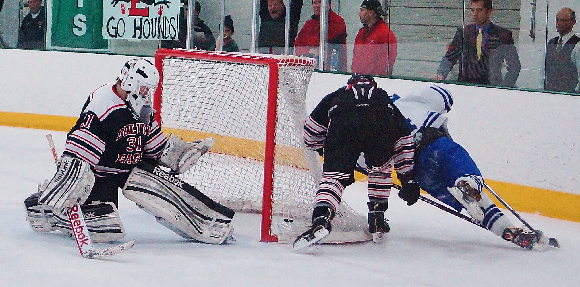 Duluth East goalie Kirk Meierhoff gave up a goal on this play against STMA in the 2013 Bantam AA state tourney semifinals. East won the game.