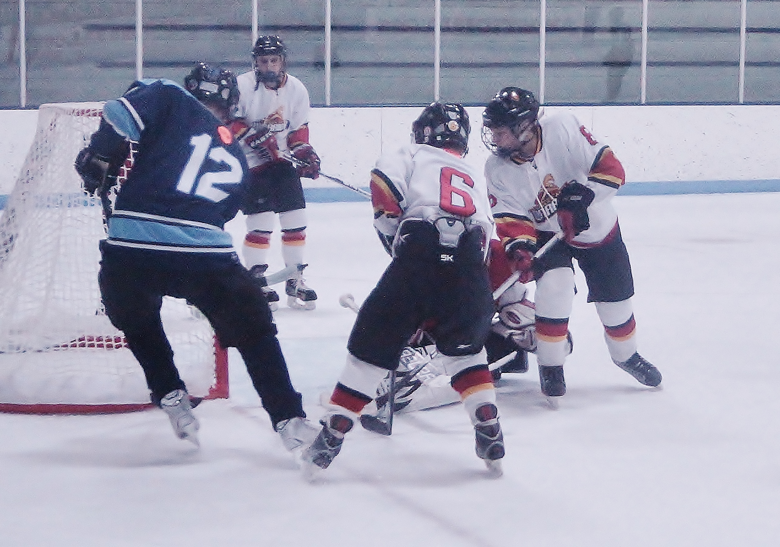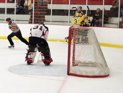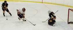 Jacob Begley playing goalie for the Mahtomedi peewee A team stops this Denfeld breakaway in the 2012 Anoka Tourney. The Zephyrs beat the Hunters 4-2.