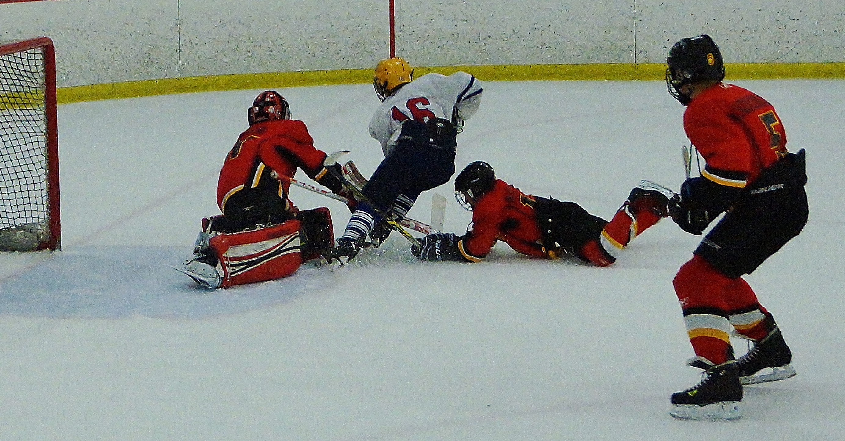 The game settled for the next three minutes. Both teams had scoring opportunities. With two minutes to go in the first period, the Flames struck with what turned out to be the winning goal. This time Caleb Strong ended up with the score to make it a 3-1. Pederson got the assist.