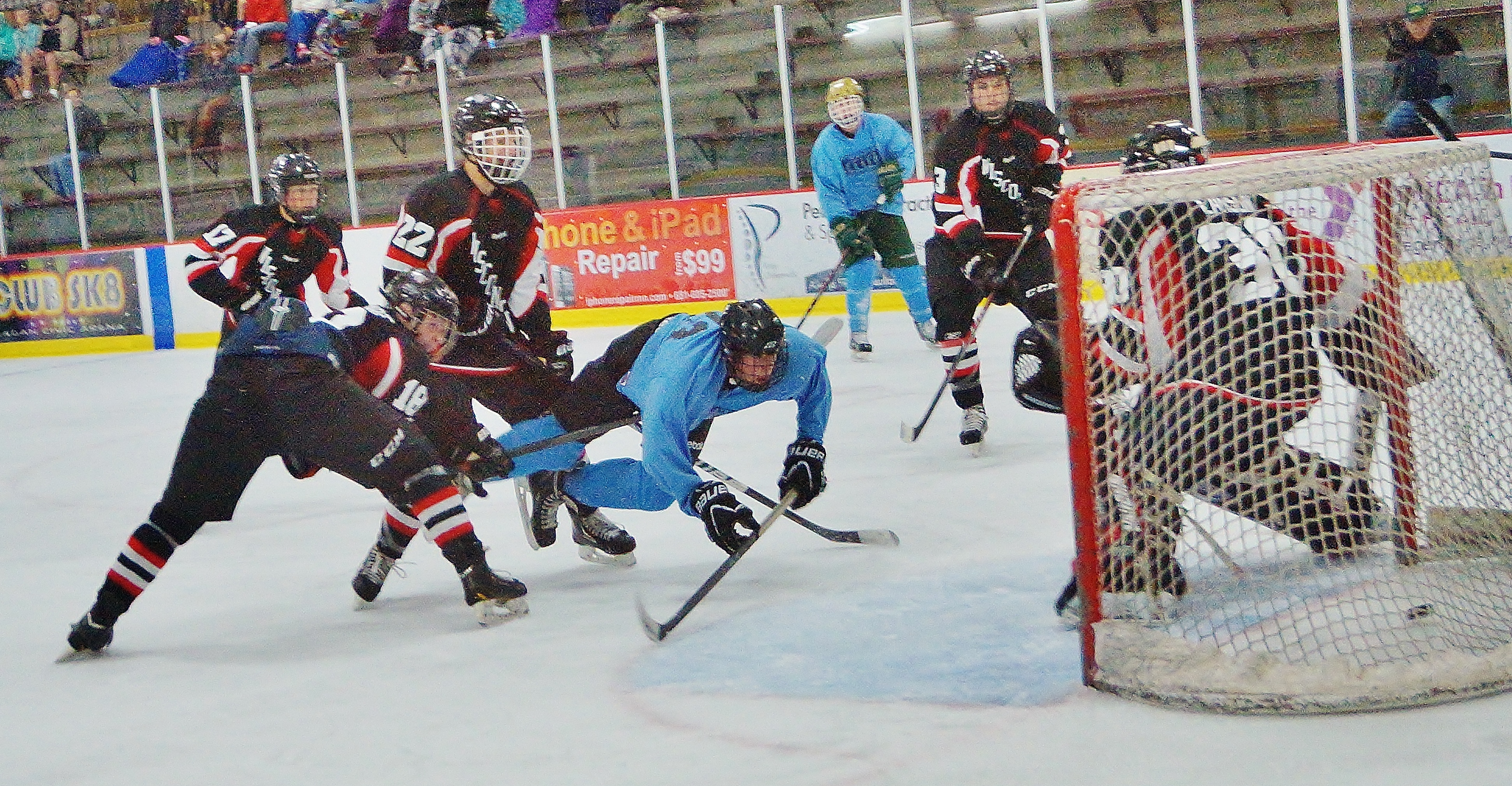 So Minn's Judd Shulz dives to get his stick on a hard sliding pass from the right to score the tying goal 3-3 against the Badgers U15 team.