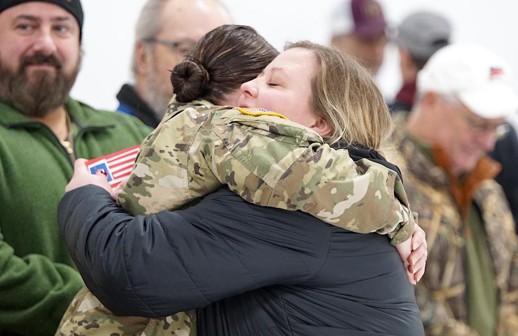 Forest Lake assistant coach Jennifer Schulz embraces Specialist Mariah Carson of the 434th Chemical Company. Carson has served in the Minnesota National Guard for three years.